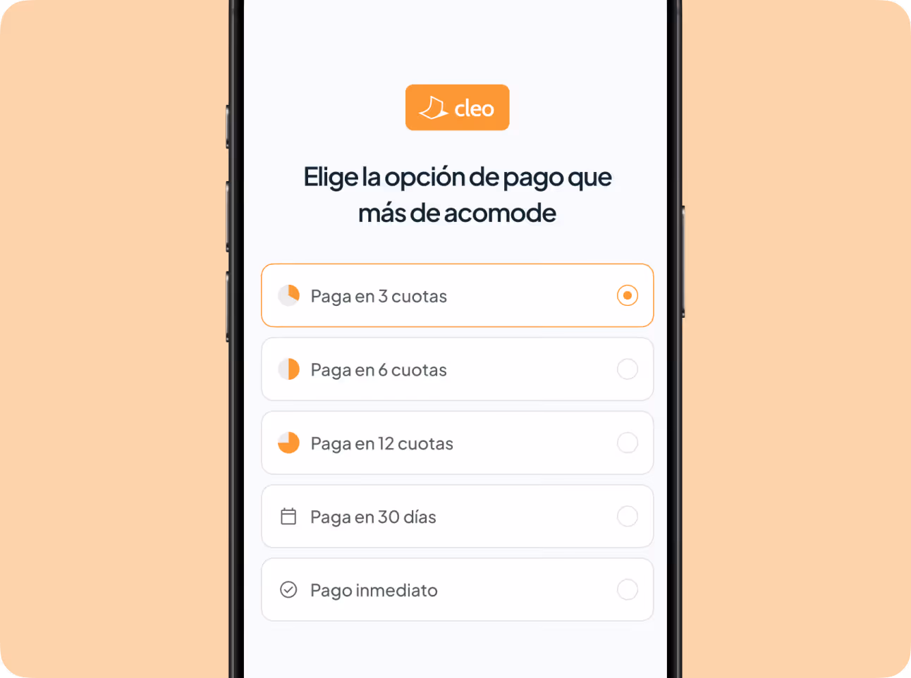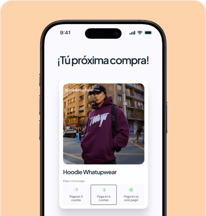 Tu cliente elige pagar en cuotas o a plazos durante el checkout, sin necesidad de tarjeta de crédito (solo con su RUT). Recibes el pago en menos de 48 horas y Cleo asume el 100% del riesgo de cobranza, encargándose de cobrar las cuotas al cliente y de cualquier gestión en caso de mora o impago.